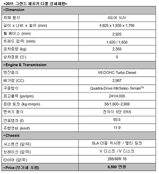 Jeep의 독보적인 사륜구동 기술력과 한층 강력해진 성능, 그리고 경제성과 환경까지 고려한 프리미엄 SUV 2011 그랜드 체로키는 전세계적으로 지금까지 4백만 대 이상의 누적 판매를 기록했으며, 전세계 SUV중 가장 많은 30여 개의 달하는 상을 수상하는 등 화려한 경력을 보유하고 있다.